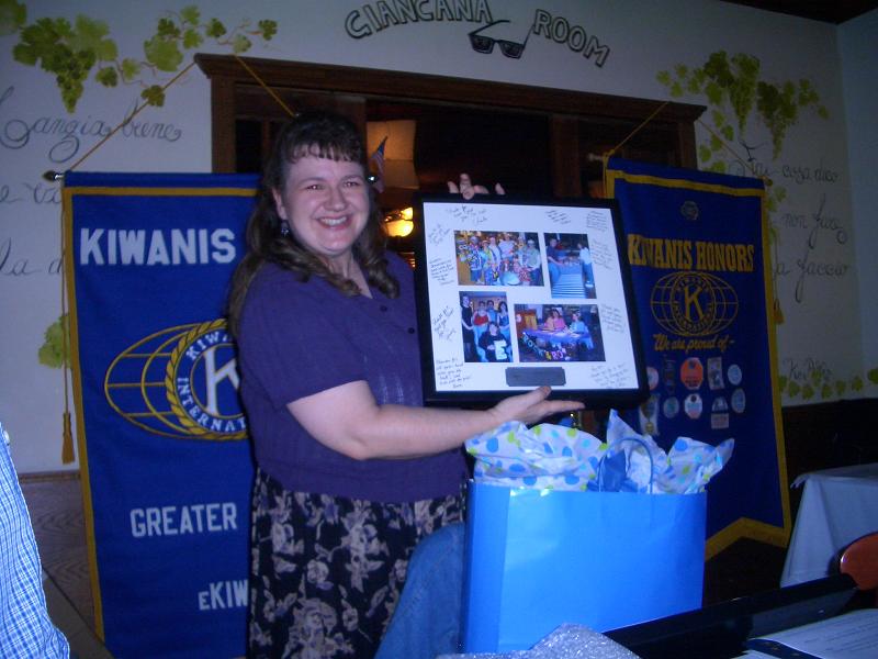 We gave her various pictures of the club (Relay for Life, Northern Illinois Food Bank, Holiday Embrace, and the Bowl-a-Thon) and had the members present at the Installment sign the matte board around the pictures. :)