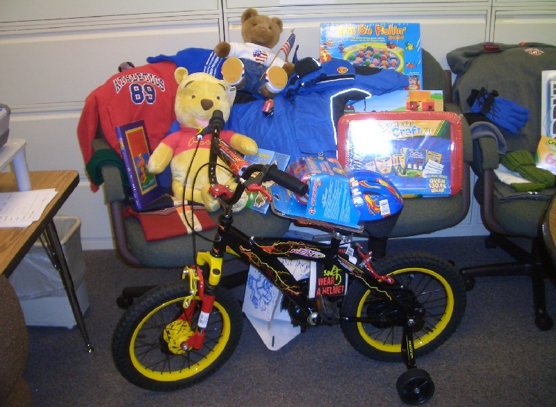 Here's the bike (and other presents donated by other groups) for the 5 year old.