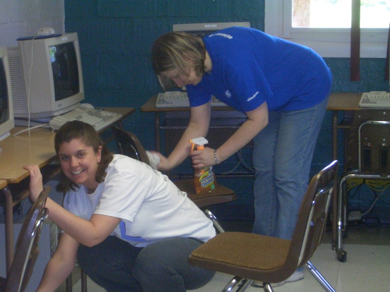 Laura and Julie cleaning the computer room. It was pretty dusty...